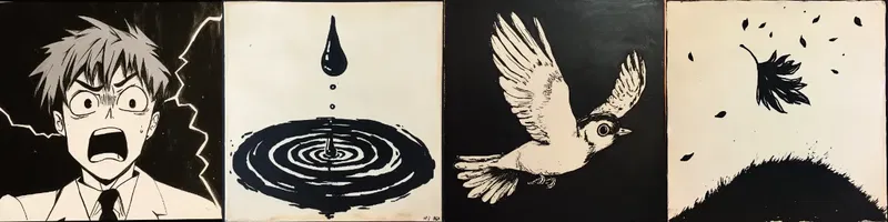 The room goes dark and a lightning strikes across the room. A droplet falls from the water cooler, somewhere a bird takes off and flies away, and a leave falls from a tree.