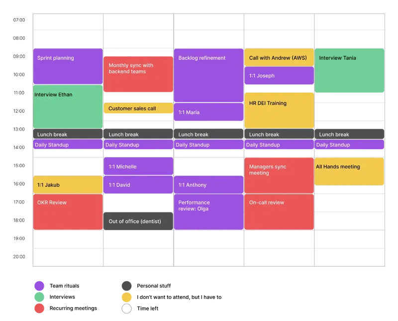 Show me your calendar was one of the most interesting prompts I’ve been using as a CTO. Time management is one of the harder skills for managers to master and one of the most important ones. You can raise money, you can save it, you can invest it, and make it grow. But you can’t do any of that with time. Time just goes away, like water in a river. You either use it wisely, or waste it.