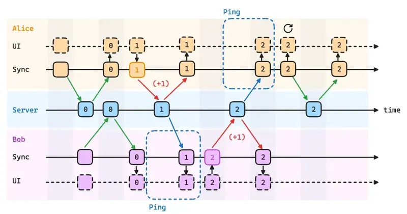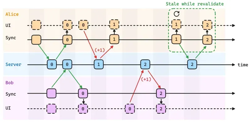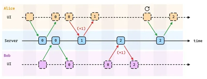 To read data, we request a “snapshot” of the server state over the network. We keep this state temporarily, meaning a refresh will fetch a newer snapshot. Writes are handled pessimistically, sent over the network, and only displayed to the user once the client receives server confirmation. This approach has worked for many years exceptionally well, offering simplicity and scalability thanks to its stateless design. However, it does come with several issues that might be unacceptable for your product: