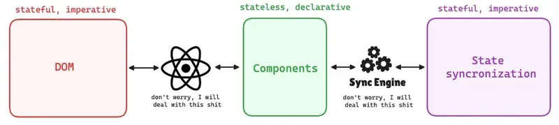 A sync engine manages interactions with the network and maintains persistent storage for the local state. Both stateful and nasty operations that we usually implement within our components. By extracting those into a separate layer, we can free ourselves from it.